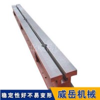T型槽铸铁地轨是一种可以装配、试验、铸铁和检验大型设备的铸梁平台, 运用灵活方便, 可以根据设备的支撑点来调整位置, 更利于对设备的操作。根据设备的固定点来设计、拼接成铸梁平台, 不用做成大型的平台, 即节省了材料成本, 又可以占用很小的空间, 性价比很高, 主要用于大型设备的装配、试验、铸铁和检验。我们威岳厂家可根据需方图纸制作或双方商定生产加工具体规格的地轨。