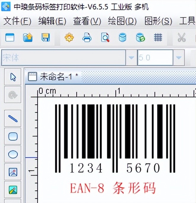 点击软件左侧工具栏中“绘制一维条码”图标,并在标签空白处进行绘制,鼠标双击绘制的条形码,弹出“图形属性”在条码类型中修改为“EAN-8”;